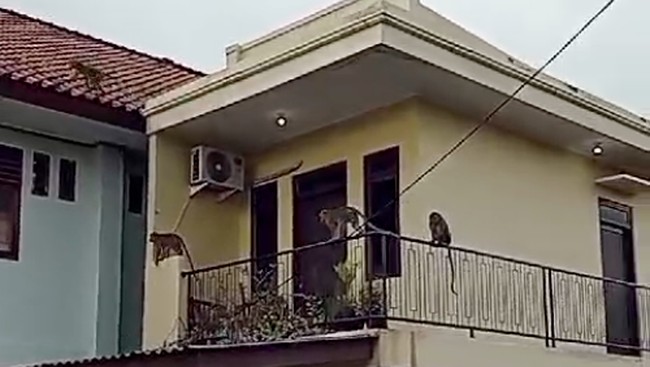 Dalam video, terlihat kawanan monyet tersebut berjalan di atas jaringan kabel listrik dan fiber optik. Lima ekor monyet tersebut juga terlihat memanjat pagar dan atap rumah warga.