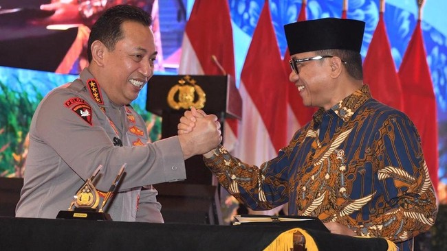 Menteri Desa dan Pembangunan Daerah Tertinggal (Mendes PDT) Yandri Susanto menandatangani Nota Kesepahaman (MoU) terkait pemanfaatan Dana Desa dengan Kapolri Jenderal Listyo Sigit Prabowo. Penandatanganan dilakukan di Tribrata Convention, hari ini.