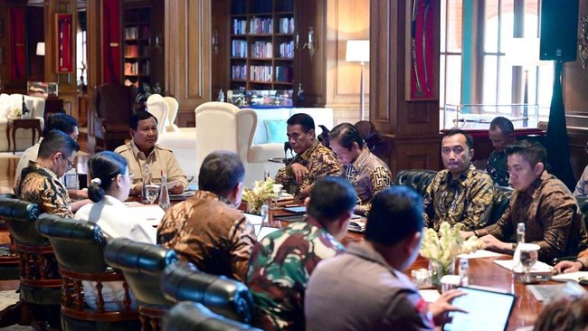 Presiden Prabowo Subianto menggelar rapat terbatas dengan sejumlah menteri di kediamannya di Hambalang, Kabupaten Bogor, Jawa Barat. Rapat disebut membahas langkah-langkah strategis dalam penataan lahan, khususnya yang berkaitan dengan perkebunan sawit.