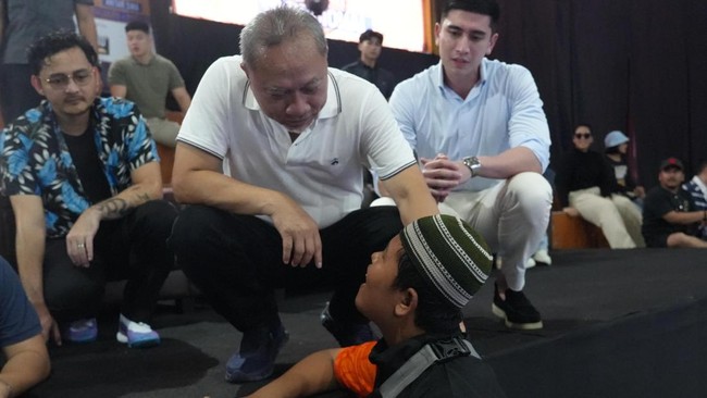 Ketua Umum PAN Zulkifli Hasan (Zulhas) memberikan bantuan kepada seorang anak difabel di GOR Basket Bekasi, Jawa Barat. Bantuan tersebut diberikan untuk membantu penyandang difabel dalam mengasah kreativitas di dunia digital.
