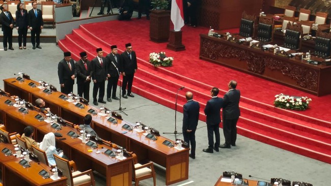 Prosesi pelantikan diawali dengan pengucapan sumpah janji para anggota. Adies memimpin pengucapan sumpah tersebut.