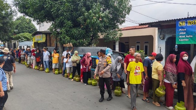 Pantauan detikcom di pangkalan LPG 3 kg Jul Chaidir, Jalan Warujaya, Sukmajay, Depok, Selasa (4/2/2025), tampak warga berbaris memanjang 10 meter. Mereka terlihat menaruh tabung gas di depannya.