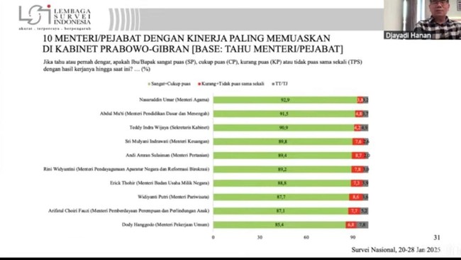 "Tingkat kepuasan paling tinggi itu yang pertama Nasaruddin Umar Menteri Agama, seingat saya Pak Nasaruddin Umar ini popularitasnya 38% atau 39%," kata Djayadi dalam jumpa pers secara virtual di kanal YouTube LSI, Rabu (5/2/2025).