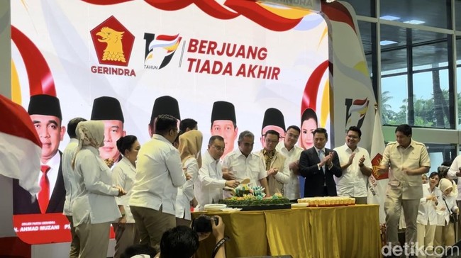 Partai Gerindra menggelar rangkaian acara HUT ke-17 di gedung MPR/DPR/DPD RI, Senayan, Jakarta, hari ini. Ketua Harian Gerindra Sufmi Dasco Ahmad dan Sekjen Gerindra Ahmad Muzani menghadiri acara tersebut.
