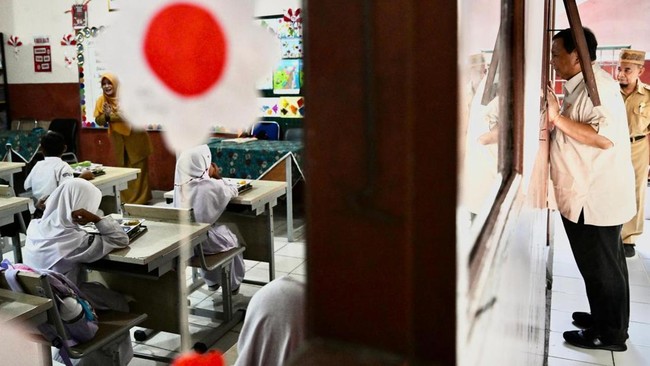 Selain itu, Prabowo terlihat duduk di kursi guru melihat proses belajar siswa. Tak hanya berinteraksi dengan siswa, Prabowo juga terlihat membaca buku yang berada di ruang kelas.