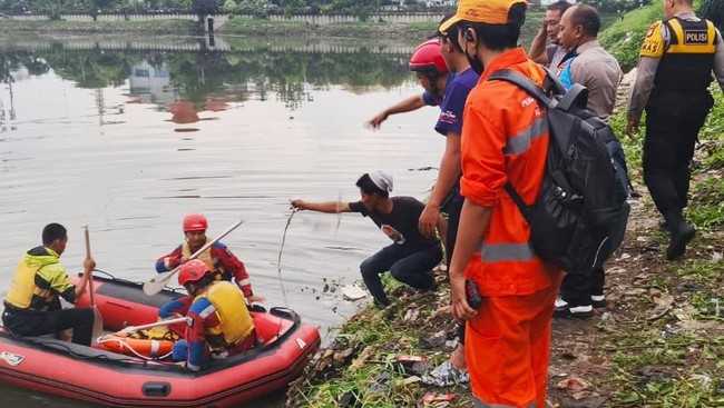 Petugas damkar mendatangi lokasi setelah mendapatkan laporan dengan membawa 1 unit perahu karet. Korban dievakuasi dalam kondisi masih hidup.