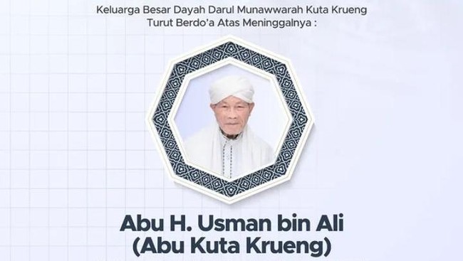 "Keluarga besar Dayah Darul Munawwarah Kuta Krueng turut berdoa atas berpulangnya ke Rahmatullah Abu H Usman bin Ali (Abu Kuta Krueng)," tulis akun Instagram resmi pesantren tersebut.