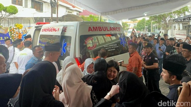 Jenazah Bendahara Umum (Bendum) DPP Partai Demokrat Renville Antonio tiba di rumah duka di kawasan Jemursari Regency, Surabaya. Keluarga dan kerabat menyambut dengan isak tangis.