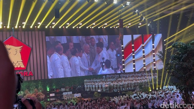 Tak lama kemudian, Presiden Prabowo Subianto dan Presiden ke-7 Joko Widodo memasuki ruang acara. Tampak hadir juga Wapres Gibran Rakabuming Raka.