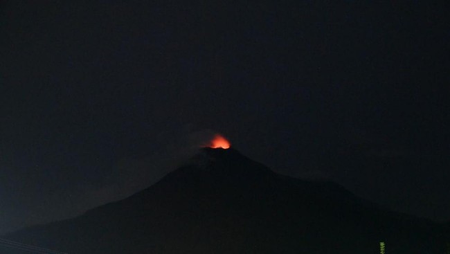 Puncak kawah Gunung Lewotobi Laki-laki di Flores Timur, Nusa Tenggara Timur (NTT), tampak merah menyala dari kejauhan. Sinar api ini teramati pada pagi ini.