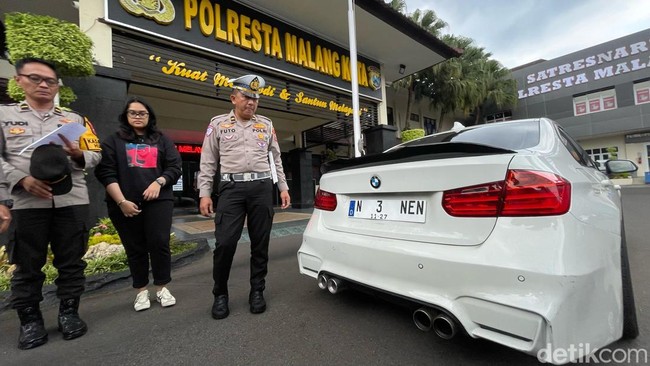 Sebuah mobil BMW warna putih yang memakai nopol N-3-NEN di jalanan Kota Malang terkena tilang. Pengemudi mengaku memakai nopol tersebut untuk keperluan konten di TikTok.