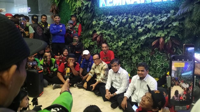 Dia dan Menteri Yassierli kemudian duduk bersila di lantai gedung bersama massa ojol. Yassierli dan Noel pun mendengarkan satu per satu aspirasi para ojol.