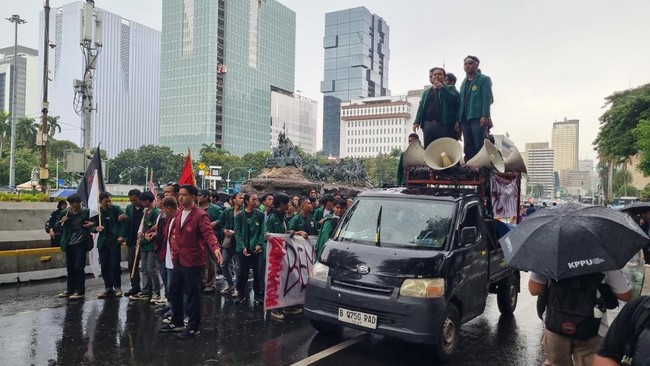 Massa Badan Eksekutif Mahasiswa Se-Indonesia (BEM SI) mulai berdatangan ke sekitar Patung Kuda, Jakarta Pusat. Mereka hendak menggelar demonstrasi bertajuk 'Indonesia Gelap'.