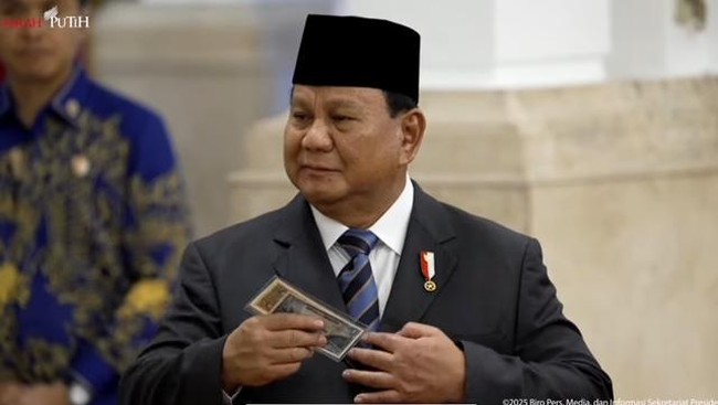 Wakil Kepala Badan Pengawasan Keuangan dan Pembangunan (BPKP) Agustina Arumsari memberikan koleksi uang rupiah kuno kepada Presiden Prabowo Subianto usai acara pelantikan selesai. Uang itu merupakan uang sejarah yang ditandatangani ayah Prabowo, Soemitro Djojohadikoesoemo, saat menjadi Menteri Keuangan.