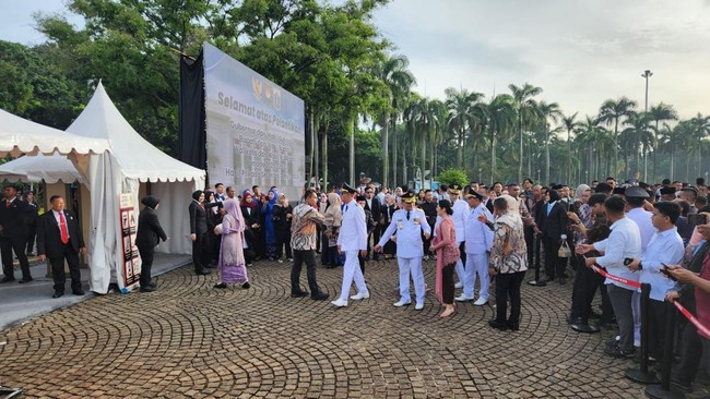 Pantauan detikcom di lokasi Kamis (20/2/2025) para kepala daerah terpilih beserta keluarga dan stafnya masuk menggunakan kendaraan pribadi ke area Monas. Kemudian, mereka diarahkan berjalan ke tenda putih yang sudah disiapkan.
