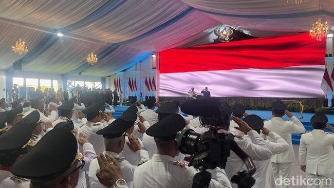 Acara dimulai dengan menyanyikan lagu Indonesia Raya dan pembacaan keputusan presiden terkait pelantikan kepala daerah.