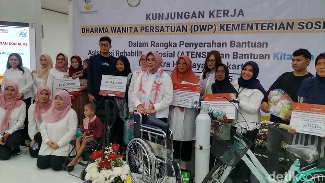 Penasihat Dharma Wanita Persatuan (DWP) Kementerian Sosial Fatma Saifullah Yusuf melakukan kunjungan ke Sentra Kreasi Atensi dan Balai Rehabilitasi Sosial Anak Perlindungan Khusus Handayani, Jakarta Timur. Kemensos memberikan sejumlah bantuan, mulai biaya pengobatan hingga dana usaha.