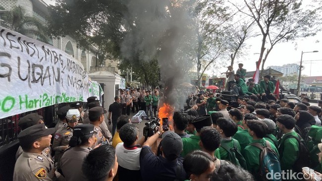 Massa aksi juga tampak membakar ban karet di depan gerbang. "Kita tidak menolak efisiensi anggaran, tapi kita minta itu dievaluasi," teriak massa, dilansir detikSumut.