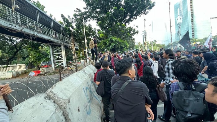 Suasana aksi bertajuk 'Indonesia Gelap' di Patung Kuda, Jakarta Pusat (Jakpus), memanas. Massa aksi berusaha merobohkan beton pembatas.