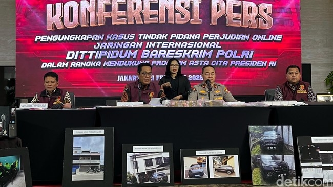 "Para pelaku ini ada yang kita dapatkan adalah korban TPPO di Filipina, yang beberapa lalu dikembalikan ke Indonesia," kata Dirtipidum Bareskrim Polri Brigjen Djuhandhani Rahardjo Puro dalam jumpa pers di gedung Bareskrim Polri, Jakarta Selatan, Jumat (21/2/2025).