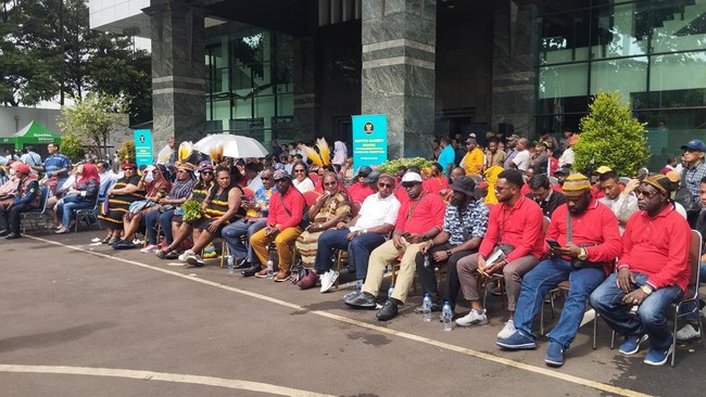 Para pendukung terlihat mengenakan seragam masing-masing. Ada pendukung dari Cagub-Cawagub Provinsi Papua Pegunungan, yakni John Tabo-Ones Pahabol, tampak mengenakan baju berwarna merah.