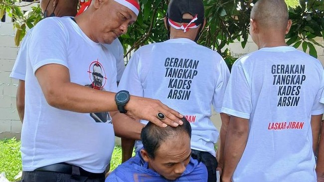 "Ini sudah janji kami, ketika Kepala Desa Arsin dan Sekdesnya Ujang Karta tertangkap atau ditahan oleh pihak berwajib. Kami warga Alar Jiban sudah dari awal akan dibotak kepalanya atau plontos secara massal," ungkapnya.