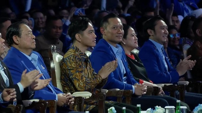 Presiden Prabowo Subianto menyinggung Ketum Partai Demokrat Agus Harimurti Yudhoyono (AHY) dan Wapres Gibran Rakabuming Raka yang duduk berdampingan. Prabowo mengatakan AHY dan Gibran berpotensi bersaing di masa yang akan datang.
