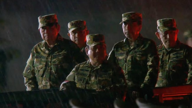 Presiden Prabowo Subianto melakukan inspeksi pasukan di upacara parade senja. Prabowo memeriksa pasukan dengan menaiki mobil maung didampingi Presiden ke-6 Susilo Bambang Yudhoyono (SBY) dan Presiden ke-7 Joko Widodo.