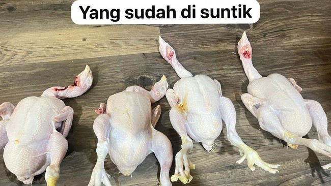 Dari foto yang diperoleh detikcom, ayam yang sudah disuntik air dan yang belum disuntik air sekilas terlihat tak ada bedanya. Bedanya, ayam yang belum disuntik terlihat lebih kurus, sedangkan ayam yang sudah digelonggong terlihat lebih gendut.
