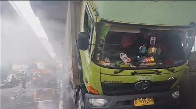 Nampak kepulan asap dari truk tersebut. Terdapat mobil pemadam kebakaran di dekat truk boks dengan nomor polisi B 9289 NEU ini.