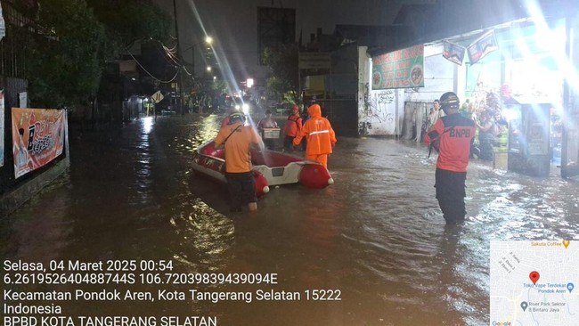 BPBD mengerahkan perahu karet untuk mobilisasi dan evakuasi warga terdampak. Berdasarkan hasil pantauan BPBD Tangsel, banjir masih belum surut pagi ini.