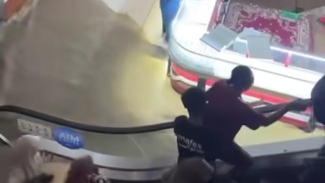 Terlihat beberapa pengunjung lari berhamburan saat banjir datang. Mereka tampak menaiki eskalator dan menuju ke lantai atas mal.