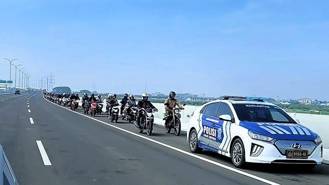 Pihak kepolisian mengawal seluruh pengendara motor untuk melintasi Tol Cibitung-Tanjung Priok. Aturan tersebut disambut sorak sorai para pemotor yang melintas.