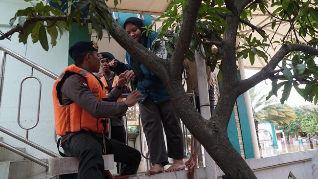 Dalam rilis Itwasum Polri, Rabu (5/3/2025), tim SAR dari Pasukan Pelopor Korps Brimob mengevakuasi warga terjebak banjir di Tambun, Bekasi, Jawa Barat (Jabar). Mereka juga membawakan bahan makanan untuk warga terdampak banjir