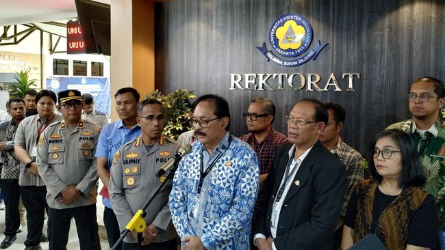 "Pasti saksi-saksi yang terkait anak-anak mahasiswa yang diperiksa sebanyak 13 mahasiswa dan 5 orang dari pihak UKI, 1 orang sebagai pelapor itu dari otoritas kampus, dan 4 orang selaku sekuriti yang bertugas pada saat itu," ujar Kapolres Jakarta Timur Kombes Nicolas Ary Lilipaly dalam jumpa pers UKI, Jakarta Timur, Jumat (7/3/2025).