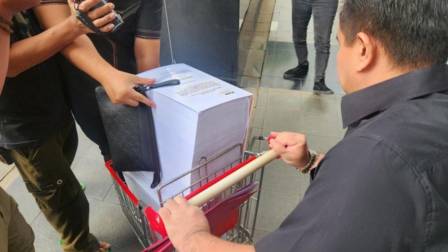 Pantauan detikcom di gedung KPK, Jakarta, Jumat (7/3/2025), salinan berkas perkara tersebut dibawa oleh pengacara Hasto, Johannes Tobing. Berkas perkara itu dibawa oleh kubu Hasto menggunakan troli keluar dari gedung KPK.