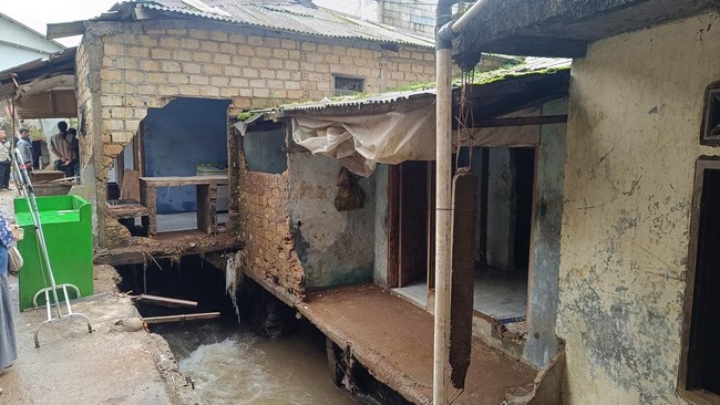 Sementara tampak dinding-dinding sejumlah rumah warga jebol dihantam luapan Sungai Ciliwung. Sehingga, Sebagian tembok rumah warga tersebut menganga terlihat bagian dalamnya.