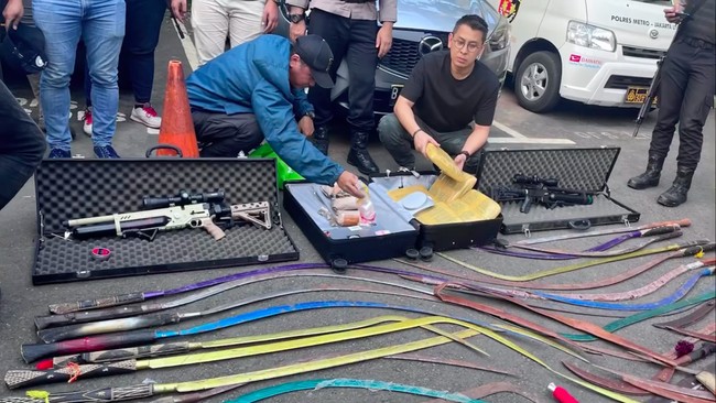 Polisi menyita 68 sajam berbagai jenis, seperti celurit, parang, dan pedang. Polisi juga menemukan dua unit airsoft gun beserta pelurunya.