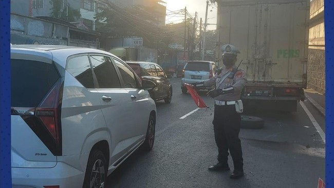 Dilihat detikcom melalui foto yang diunggah TMC Polda Metro, terlihat petugas sudah berada di lokasi untuk melakukan pengaturan lalu lintas. Terlihat ban truk berada di belakang kendaraan tersebut. Sementara itu lalu lintas terpantau tersendat.