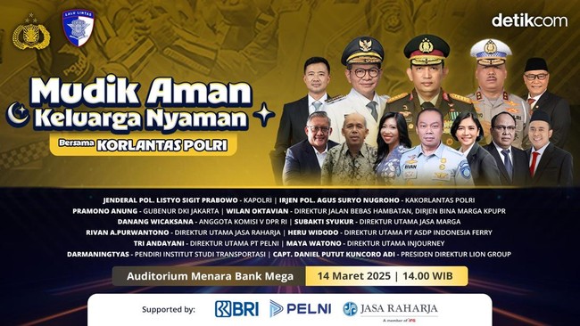 detikcom menggelar acara 'Mudik Aman, Keluarga Nyaman Bersama Korps Lalu Lintas (Korlantas) Polri'. Agenda ini digelar untuk mendukung pelaksanaan Operasi Ketupat 2025 dalam mendukung arus mudik dan arus balik Lebaran 2025.