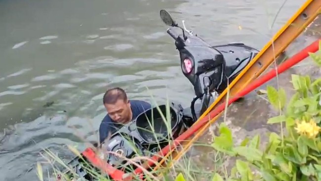 Petugas Damkar kemudian mengevakuasi motor yang tercebur itu. Dalam video yang dibagikan, evakuasi dilakukan menggunakan sejumlah peralatan.
