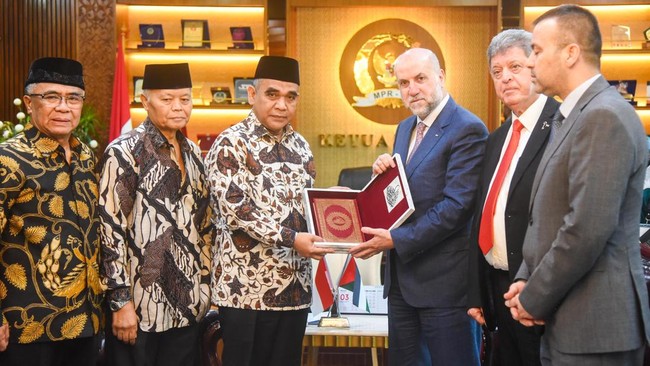 Ketua MPR RI Ahmad Muzani menerima Penasihat Khusus Presiden Palestina yang juga merangkap Menteri Kehakiman, Mahmoud Al Habbash beserta delegasi, Duta Besar Palestina untuk Indonesia Zuhair S.M Alshun. Muzani pun menyampaikan terima kasih atas kunjungan Mahmoud Al Habbash beserta delegasi.