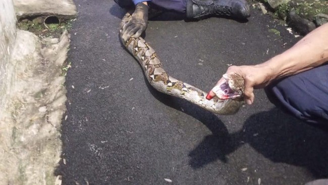"Penanganan sekitar 15 menit, alhamdulillah berjalan aman dan lancar. Ular dibawa ke mako, nanti kita koordinasikan ke instansi terkait soal tindak lanjutnya, apa dilepasliarkan atau seperti apa," kata Ade.