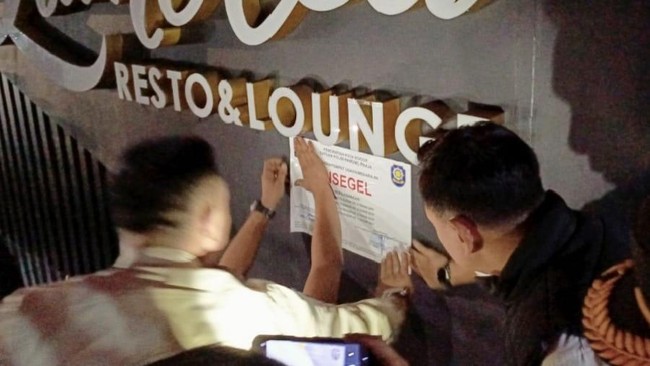 Wakil Wali Kota Bogor Jenal Mutaqin bersama Satpol PP dan kepolisian menyegel tempat hiburan malam (THM) di Jl Raya Pajajaran, Bogor Timur, Kota Bogor. THM yang sediakan karaoke dan live music itu dianggap ngeyel karena beroperasi saat Ramadan.
