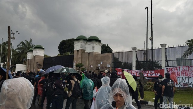 Massa aksi tolak pengesahan Revisi UU TNI masih bertahan di depan gerbang utama gedung DPR RI, Senayan, Jakarta Pusat. Massa bertahan meski hujan mengguyur lokasi.