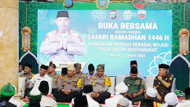 "Alhamdulillah hari ini kami bisa melaksanakan kegiatan safari Ramadan di Masjid Raya Al-Mashun bersama-sama dengan TNI kemudian Polri, tokoh-tokoh ulama, masyarakat dan ini tentunya menjadi salah satu kegiatan yang tentunya kita harapkan bisa membawa kemanfaatan, meningkatkan sinergi antara TNI Polri dan masyarakat, umara dan ulama," kata Jenderal Sigit kepada wartawan, Sabtu (22/3/2025).