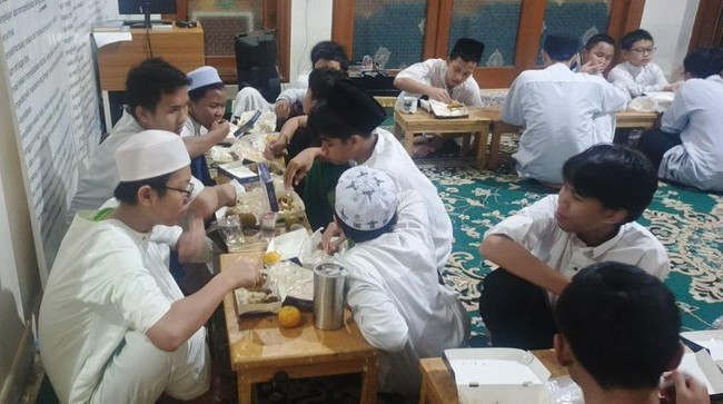 Para santri santap makanan bersama dalam kehangatan pada Selasa (25/3). Paket berbuka puasa yang telah diberikan merupakan hasil donasi dari sahabat baik sebesar Rp 2,5 juta.