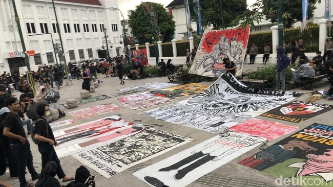 Pantauan detikJogja, Kamis (27/3/2025), massa mulai berdatangan di kawasan Nol KM pukul 16.00 WIB. Massa lalu membentangkan spanduk-spanduk berukuran besar tepat di sudut depan Istana Kepresidenan Yogyakarta.