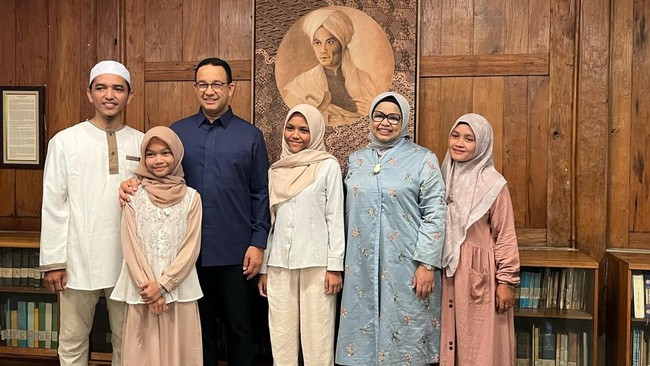 Tampak di halaman pendopo rumah Anies, puluhan orang sudah mengantre ingin berlebaran dengan Anies Baswedan. Di dalam pendopo, Anies didampingi sang istri, Ferry Farhati, Anies menyambut tamu yang berasal dari berbagai daerah.