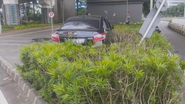 Tanaman dan papan penunjuk jalan di lokasi tampak rusak setelah ditabrak sedan. Sedan tersebut mengalami out of control hingga masuk ke taman.